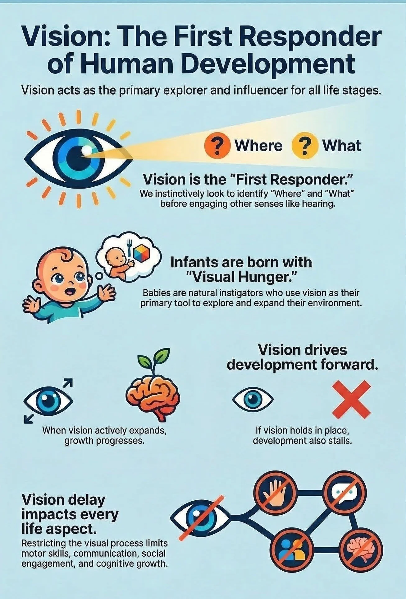 I encourage you to use your observations in Just Look Retinoscopy to ensure that vision is a key influencer in development, in fact the initiator, instigator and influencer of all actions toward engagement.
